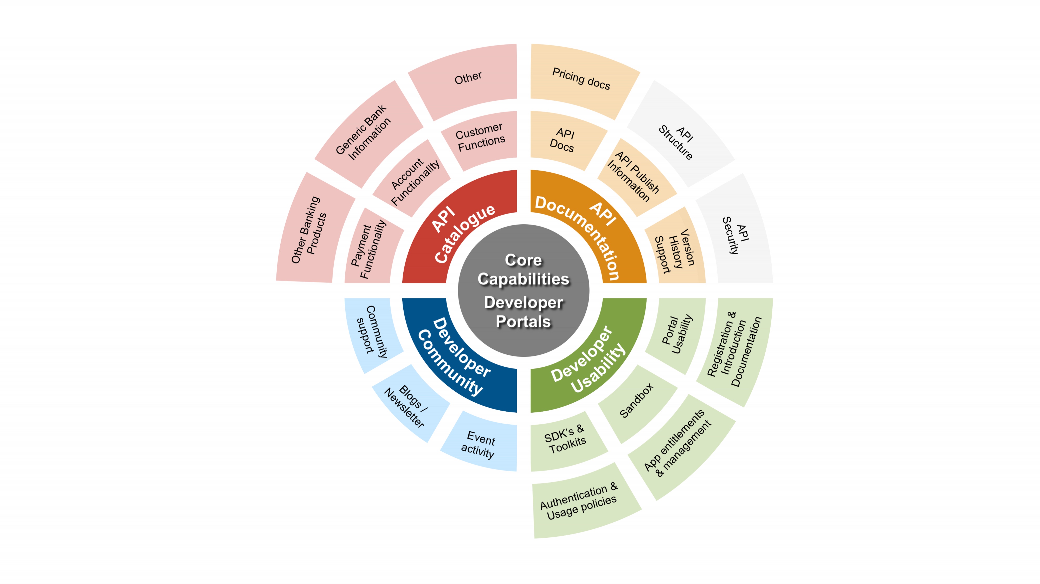 في تقييم القدرة ، نركز على جوانب محددة من استراتيجية الخدمات المصرفية المفتوحة ، أي الثراء الوظيفي لواجهات برمجة التطبيقات المقدمة (مثل النطاق الوظيفي) ومدى قدرة الأطراف الثالثة على التفاعل مع واجهات برمجة التطبيقات هذه بطريقة سلسة (مثل تجربة المطور). بوابة مطوري واجهة برمجة التطبيقات للبنك هي المكان الذي تجتمع فيه هذه الجوانب معًا.